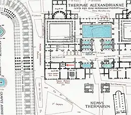 A primeira evidência documental é de 998. O complexo havia caído nas mãos dos monges beneditinos da Abadia de Farfa e o um documento existe detalhando um acordo entre seu abade e o clero encarregado de Sant'Eustachio in Campo Marzio. Christian Hülsen[3] cita um trecho: "Due ecclesiae Sanctae Mariae et Sancti Benedicti quae sunt aedificatae in thermis Alexandrinis, cum casis, criptis....et oratorio Salvatoris infra se" ("Duas igrejas, Santa Maria e São Bento, foram construídas nas Termas Alexandrinas, com edifícios, criptas ... e incluindo o oratório do Salvador". A igreja de São Bento ficou conhecida mais tarde como San Benedetto de Ferro e a dedicada a Nossa Senhora, como Santa Maria della Cella. Ambas foram demolidas pelas instituições francesas ligadas à vizinha igreja de San Luigi dei Francesi[2].