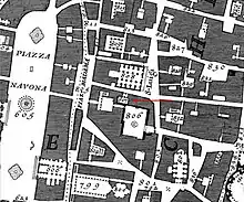 Esta igreja não ficava na rua propriamente dita, mas paralela a ela no terreno do palácio. Ocupava o espaço no canto noroeste do pátio maior do palácio, um pouco mais ao sul da mais ocidental das três capelas da nave de San Luigi, do outro lado da rua. Este pátio hoje foi coberto e está ocupado por construções modernas e o local onde a igreja ficava é inacessível para o público[8].