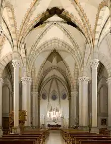 Em estilo neogótico, a igreja conta com três naves separadas por colunas terminadas em capitéis coríntios, cobertas por uma abóbada em cruzaria e com várias capelas laterais.