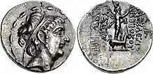 Dracma de Antíoco X Eusébio descrevendo Sandes