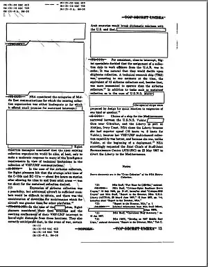 Em outros casos, como o relatório da NSA sobre o incidente do USS Liberty (à direita), o relatório pode ser higienizado para remover todos os dados confidenciais, para que o relatório possa ser divulgado ao público em geral.