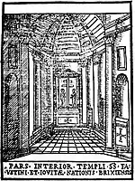 A fachada, que se conhece através de antigas fotografias, tinha dois andares e apenas uma entrada. O primeiro era bem simples, com quatro pilastras dóricas em pares suportando um entablamento com a inscrição dedicatória no friso. Entre os pares estava a entrada, que tinha duas semi-colunas jônicas sobre plintos suportando um frontão triangular. O tímpano estava decorado com duas palmas entrecruzadas, uma alusão aos dois mártires da dedicação original.