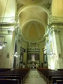 A decoração no interior é mais sóbria, majoritariamente em amarelo claro com detalhes em branco. O altar-mor na abside tem uma edícula em mármore multicolorido e a peça-de-altar é um venerado ícone de Nossa Senhora das Graças de Gilles Halet.