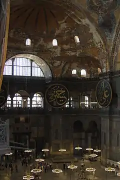 Tanto no lado da entrada ocidental e quanto no lado oriental, litúrgico, há aberturas em forma de arco ampliadas por semi-domos de diâmetro idêntico ao domo central, suportados por êxedras em forma de semidomos: uma hierarquia de elementos encimados por domos construídos de forma a criar um vasto interior de forma oblonga culminando no domo central, com uma abertura de 76,2 metros no total.[5]