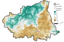 O município tem altitudes de 90 m, no extremo sudeste, a 1.040 m, com terreno acidentado. 10% do território é de fundo de vale (declividade de até 8%), 30% de colinas e morrotes (de 8 a 45%), 50% é montanhoso (45 a 75%) e 10% de montanhas escarpadas (declividade de 75%).[101] A baixada tem terreno mais ondulado e passível de mecanização agrícola.[102]