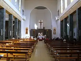 O interior da igreja se apresenta em três naves separadas por colunas de mármore. Na abside, bem simples, está um grande crucifixo de madeira central e dois ícones laterais que reproduzem os arcanjos Miguel e Gabriel prostrados; dos lados do arco absidal estão dois ícones representando São Francisco de Assis (esquerda) e Santa Catarina de Siena (direita). Abaixo do crucifixo, atrás do altar-mor em mármore branco, está um sacrário de bronze dourado. Finalmente, dos lados da abside estão duas cantorias simples. As duas capelas laterais são dedicadas ao Sagrado Coração de Jesus e a Virgem Maria Salvadora.