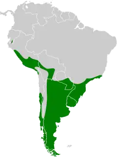 Pode ser encontrada nos seguintes países: Argentina, Bolívia, Brasil, Chile, Equador, Ilhas Malvinas, Paraguai, Peru, Ilhas Geórgia do Sul e Sandwich do Sul e Uruguai.