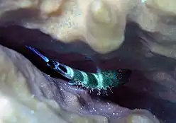 Sarampinho escondido em meio de ramos de coral nas Ilhas Virgens, no Caribe.