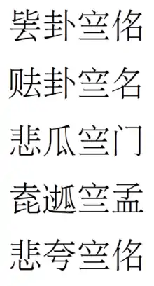 - Símbolos que não se parecem com caracteres chineses oriundos de sistemas que não usam a escrita chinesa como o.[8] Exemplo, "k" é usado na página 1031 do 平 果 嘹 歌:. 长 歌集 publicado pela 广西 民族 出版社 em 2004, ISBN 7-5363-4820-7 </ ref> alfabeto birmanês.