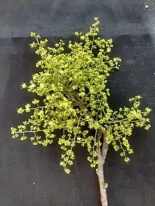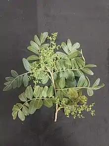A sua floração se inicia geralmente no fim da estação chuvosa, podendo variar em cada região e ano, no Mato Grosso do Sul acontece em julho, Ceará de novembro a dezembro e em Pernambuco de novembro a fevereiro. A inflorescência apresenta-se em panículas, terminais a subterminais com até 12 cm de comprimento, brancas, perfumadas levemente e é polinizada principalmente por abelhas, o que explica o tamanho pequeno das flores, medindo de 3 mm a 4 mm de diâmetro.[4] Os frutos são do tipo sâmara, secos, indeiscentes, monospérmicos com pericarpo membranoso, drupa alada de coloração castanha clara variando de acordo a maturação. O mesocarpo é esponjoso e o endocarpo lenhoso impermeável à água, base aguda, superfície lisa, oblonga, estrutura falciforme medindo de 3 cm a 3,5 cm de comprimento contendo apenas uma semente de forma obovóide-reniforme, medindo 14,37 mm ± 1,56 mm de comprimento, 9,81 mm ± 0,79 mm de largura e 5,56 mm ± 0,84 mm de espessura.[9][12][6]