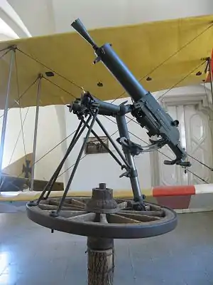 ![]() MG M.7/12 montada em uma roda em uma configuração antiaérea da época da Primeira Guerra Mundial. | |