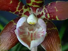 As flores são grandes, abrem-se bem e duram cerca de duas semanas.[2] Têm sépalas de tamanhos similares e formam um mento quase imperceptível com o pé da coluna. As pétalas, podem ser parecidas com as sépalas, mas pouco menores, ou bastante menores e com a base bem mais estreita, ocasionalmente com padrões diferentes de cores ou desenhos. O labelo articula-se com o pé da coluna, é trilobado, com lobos laterais comparativamente pequenos e terminal ampliado, em formatos variáveis, em regra com desenhos diversos e calo sob a coluna. Esta é semi-cilíndrica, levemente arqueada, ereta e espessa, sem qualquer tipo de apêndice, terminando em antera apical e prolongada em pequeno pé na base. As flores apresentam dois pares justapostos de polínias de tamanhos diferentes. O caudículo é estreito e o retináculo, pequeno. Os frutos lembram, os de Maxillaria.[8] Não há registros da observação dos agentes polinizadores em atividade mas supostamente são polinizadas por abelhas Euglossini.[7]