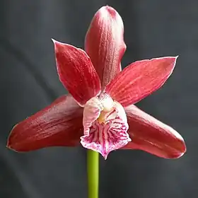 Apresentas longas folhas roliças que brotam de pseudobulbos quase imperceptíveis; poucas flores comparativamente grandes vistosas e coloridas, com labelo contrastante. Pode ser diferenciada das outras espécies do gênero por ser única espécie epífita, de crescimento reptante ascendente, com folhas eretas; e de flores com sépalas e pétalas inteiramente púrpura acastanhadas, com estreito labelo branco, internamente pubescente e bastante venulado de púrpura.[2]