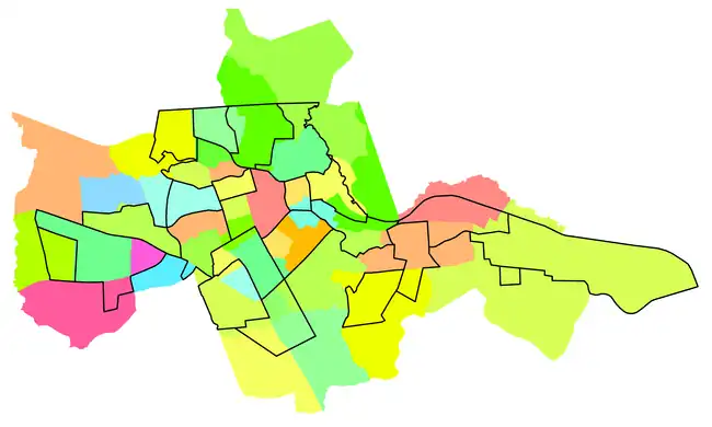 Em 1982 o distrito tem a sua primeira divisão oficial em bairros[6], em 1986 são feitas pequenas mudanças[7]. Porém, foram criados bairros avulsos antes de 1982, como é o caso do Bairro Roberto Holtermann que fora criado em 1961[8], e hoje é uma unidade residencial do bairro Nossa Senhora de Fátima com o nome de Vila Holtermann.