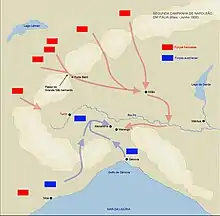 Tendo de enfrentar a situação na Alemanha e na Itália, Napoleão decidiu assumir o comando das tropas neste último teatro de operações[16]. O que restava do Exército de Itália foi colocado sob o comando de Massena que recebeu a missão de fixar os Austríacos perto de Génova. No entanto, o sistema logístico utilizado (viver dos territórios onde atuavam) obrigava a dispersar as tropas para se poderem abastecer. No dia 5 de abril de 1800, os Austríacos atacaram de surpresa e o exército de Massena que, perante um inimigo com o dobro dos efetivos, ficou dividido em dois. Massena, com cerca de 10.000 homens do corpo de tropas de Soult, refugiou-se na praça de Génova, que foi cercada pelas tropas austríacas. Desde 19 de abril, com o apoio de uma frota britânica foi bloqueado o acesso à cidade por terra e por mar. Génova acabou por capitular a 4 de junho de 1800[17]. As restantes forças francesas, sob o comando do general Suchet, foram perseguidas para além de Nice pelas tropas austríacas, sob o comando do general Melas. Este, partindo do princípio que os Franceses não estavam em condições de lançarem uma ofensiva na Itália, dispersou as suas forças numa frente de quase 250 km a fim de guardar as passagens nos Alpes. Preparava-se para, após a queda de Génova, invadir a França pela região da Provença.