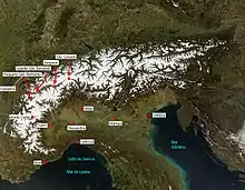 As principais passagens para a travessia dos Alpes continuam a ser as que foram utilizadas por Napoleão Bonaparte (1800) ou até por Aníbal Barca (218 a.C.): o passo do Grande São Bernardo liga o cantão de Valais (Suíça) a Aosta e Ivrea (Itália) e situa-se a uma altitude de 2.468 metros; o Passo do Pequeno São Bernardo liga Bourg-Saint-Maurice, no departamento de Saboia (França), a La Thuile, no vale de Aosta (Itália), e atinge uma altitude de 2.188 metros; o passo de São Gotardo liga Airolo (Suíça) e Bellinzona (Suíça), a uma altitude de 2.108 metros; o passo do Simplon liga Briga (Suíça) a Domodossola (Itália) a uma altitude de 2.009 metros[5].