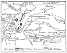 - No dia 11 de junho, Napoleão redistribuiu as forças por forma a enfrentar os austríacos. A Sul do rio Pó, perto de Voghera, onde existia uma pequena fortaleza que controlava a ponte por onde a estrada Voghera – Alexandria atravessava o rio Scrivia, ficaram as seguintes forças[31]: