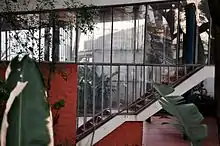 A divisão se dá por nove espaços, sendo esses garagem, lavanderia, acesso, dormitório, cozinha, sala de estar, estúdio, e a primeira casa da construção.[8] Situado ao lado do living, o terraço é contínuo até o escritório,conectando os espaços e abre-se em três lados para a maior parte do terreno, que é ocupada pelo jardim. O espaço social é volumoso, porém simples, separado do exterior apenas por paredes.[9]O salão de estar possui altas janelas nas duas faces principais que dão vista para o terraço com pé-direito duplo.Essas áreas são ligadas por uma escada que se encaixa harmoniosamente entre os panos de vidro.[10]