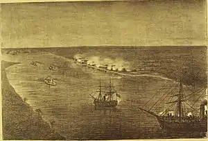 ![]() Segunda passagem do Curupaity, efetuada, na noite de 13 de fevereiro de 1868, pelos monitores Pará, Alagoas e Rio Grande, às ordens do chefe de divisão, Barão da Passagem (A Vida Fluminense, 1868). | |||