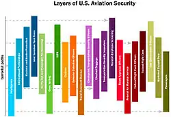 Monte R. Belger, da Administração Federal de Aviação dos EUA, ressalta: "O objetivo da segurança na aviação é evitar danos às aeronaves, aos passageiros e à tripulação, bem como apoiar a segurança nacional e a política antiterrorismo".[3]
