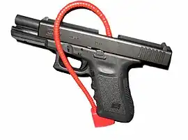 - Embora não existam padrões universais para o projeto ou teste de travas de gatilho, algumas jurisdições, como o estado da Califórnia, mantêm uma lista de dispositivos de bloqueio de gatilho aprovados.[18] No Canadá, uma trava de gatilho é um dos métodos prescritos por lei para proteger uma arma de fogo durante o transporte ou armazenamento.[19]