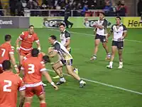 Ilhas Cook atacando Tonga na Copa do Mundo de Rugby League de 2013.
