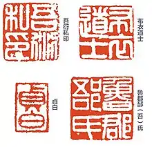 Existem muitas classes de selos pessoais. Os selos privados são naturalmente não regulamentados; [22], portanto, apresentam a maior variedade em conteúdo, formato, tamanho, material e caligrafia de qualquer tipo de selo. [22] Selos com nomes, pseudônimos, pseudônimos, etc. foram usados como um dos primeiros tipos de assinatura por pessoas em suas vidas privadas. [22] Os artistas também assinavam suas obras e cartas com seus selos. [22] Além disso, sabe-se que os literatos chineses costumam usar vários pseudônimos diferentes em suas obras, portanto, tentar identificar o nome de uma pessoa a partir de um selo específico pode ser uma tarefa complicada. [22]