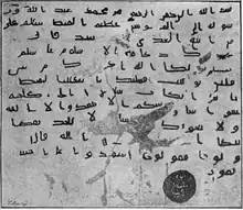 O selo é uma peça um tanto retangular de ágata vermelha de cerca de 1 cm de comprimento, com as frases: الله - Alá: "Deus" na primeira linha, e محمد رسول - Muhammad rasūl: "Maomé, o mensageiro" na segunda linha.