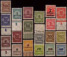Para fazer frente aos graves défices orçamentais, o governo alemão continuou a emitir mais dinheiro sem lastro, levando à queda do valor do marco e ao afundamento da economia alemã. A inflação disparou e atingiu uma taxa média equivalente de 20.9% ao dia[6]. Os Correios não conseguiam acompanhar uma tal taxa de inflação através da emissão de novos selos, pelo que iam sobrecarregando os existentes com valores faciais cada vez maiores[7], atingindo os vários milhões de marcos num único selo normal de correio.