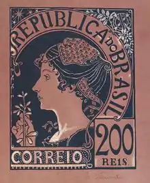 Três anos após a emissão dos selos de 01 de janeiro de 1900, os esforços do Sr. Ernesto Pinto de Azeredo Coutinho, da Diretoria Geral dos Correios, fazem com que esta Diretoria estabeleça concurso para desenhos de novos selos e demais fórmulas de franquia dos Correios dos Estados Unidos do Brasil. O pintor Eliseu Visconti participa dos três concursos de selos postais e cartas-bilhete, num total de dezesseis projetos, sendo declarado vencedor dos três concursos em janeiro de 1904. Os projetos de selos postais de Visconti jamais seriam executados, supõe-se que por falta de recursos. No entanto, a aceitação que tiveram por parte da imprensa especializada, inclusive na Europa e na América, foi comprovada pelo número de vezes que foram publicados, inclusive na revista francesa L’Illustration que, em sua edição de 12 de novembro de 1904, reproduziu com elogios todos os projetos de Visconti. Tendo sempre a mulher como principal protagonista, Visconti representou os fatos mais significativos da história do Brasil e homenageou ainda as artes, o comércio, a indústria, a correspondência, a energia elétrica e a aeronáutica. Gonzaga Duque, o mais importante crítico de arte à época, comentaria em artigo na Revista Kosmos: A série magistral de postais do Sr. Eliseu Visconti faria a reputação filatélica de qualquer povo. É, em verdade, uma coleção extraordinária, sem competidora na reputada Europa.[17]
