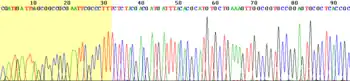 No caso de uma sequência de ADN, o "texto" é um consistindo apenas de 4 letras correspondentes aos quatro nucleotídeos formando a sequência de um dos filamentos de DNA: A para adenina, G para guanina, T para timina, C para citosina. Tem-se que ter cuidado se a direção da leitura puder ser 3' para 5' ou inversa.[6][7]