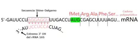 O páreamento entre o rRNA e a sequência de Shine-Dalgarno é um mecanismo pelo qual a célula pode distinguir entre os códons de início de tradução da proteína e códons AUG internos e/ou fora-de-quadro. O nível de complementariedade também influencia na força de ligação do ribossomo e regula a taxa de produção de proteínas.[5]