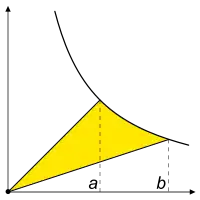 A área de um setor hiperbólico em posição padrão é o loge b. (Demonstração: Integrar sob a curva 1/x entre 1 e b, e somar-lhe a área do triângulo {(0, 0), (1, 0), (1, 1)}, e debitar-lhe a área do triângulo {(0, 0), (b, 0), (b, 1/b)})