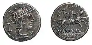 | Busto com elmo; uma âncora (esq.). | General romano em uma Biga em triunfo. Inscrição ROMA acima e SEX•IVL•CAISAR abaixo. |