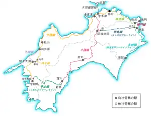 | Tipo | Nome | Terminais e estações intermediárias (Estações fora da Shikoku estão em parêntesis) |