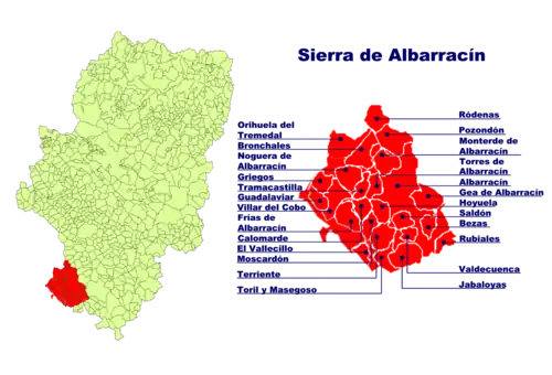 - Municípios: Albarracín, Bezas, Bronchales, Calomarde, Frías de Albarracín, Gea de Albarracín, Griegos, Guadalaviar, Jabaloyas, Monterde de Albarracín, Moscardón, Noguera de Albarracín, Orihuela del Tremedal, Pozondón, Ródenas, Royuela, Rubiales, Saldón, Terriente, Toril y Masegoso, Torres de Albarracín, Tramacastilla, Valdecuenca, El Vallecillo e Villar del Cobo.