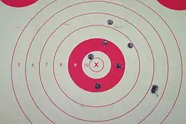 Cada agrupamento é descrito pelo círculo de diâmetro mínimo perpendicular ao eixo do movimento do projétil, incluindo o ponto de impacto de todos os projéteis nesse agrupamento.[3] Uma arma de fogo consistentemente posicionando balas dentro de um círculo de 1 polegada (25,4 milímetros) de diâmetro em um alvo a 100 jardas (91,4 metros) do cano pode ser descrita como capaz de gerar agrupamentos de 1 polegada a 100 jardas.