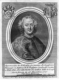 Criado cardeal sacerdote no consistório de 26 de novembro de 1727; com um breve apostólico de 23 de dezembro de 1727, o papa lhe enviou o barrete vermelho; o imperador impôs o barrete ao novo cardeal em 4 de abril de 1728, na igreja dos agostinianos. Para cobrir as despesas associadas ao cardinalato, o imperador deu-lhe em 1728 a abadia de São Miguel em Báta, diocese de Pécs, Hungria; e também o cargo de reitor de Zwettl e da paróquia soberana associada de Eggenburg. Nomeado inquisidor geral para Espanha e Sicília, 27 de novembro de 1728 (4); neste cargo contou com a ajuda do padre Georg Ruess, OESA Em 1729 a arquidiocese de Viena recebeu cerca de oitenta paróquias que até então pertenciam à diocese de Passau, que ficavam no distrito dos Bosques de Viena. Em conexão com a expansão do território arquidiocesano, o cardeal conseguiu o estabelecimento de um bispo auxiliar permanente. O cardeal procurou conhecer as novas paróquias e visitá-las rapidamente. Em um longo processo, ele alcançou em 1729 a eliminação da isenção do capítulo. Em compensação, em 1734, deu aos cônegos dos capítulos o direito ao uso da pontificalia . Participou do conclave de 1730, que elegeu o Papa Clemente XII. Recebeu o chapéu vermelho e o título de Ss. Marcellino e Pietro, 14 de agosto de 1730. Protetor da Ordem de Szent Paul (Padres Paulinos) na Áustria, Hungria, Polônia e ao longo do Reno, 21 de julho de 1734. Membro da comissão para examinar as queixas dos protestantes na Hungria, 1734. Para promover a devoção à Eucaristia, estabeleceu a oração de 40 horas; ordenou que os sacerdotes da arquidiocese acompanhassem o Santíssimo Sacramento em procissões com tochas. Em 1735, o cardeal KoIlonitsch também ordenou que, em memória do sofrimento de Cristo, o sino tocasse na quinta-feira à noite e na sexta-feira de manhã. A veneração de São João de Nepomuk foi fortemente promovida; e o cardeal também criou um novo ritual diocesano. Em 1736,(5) . Ele apresentou um programa de contra-reforma com base nas disposições religiosas da Paz de Vestfália. Este movimento, embora sem sucesso, trouxe várias melhorias. Nas terras das missões foi nomeado capelão na própria Viena com a preocupação pelos convertidos. O cardeal também construiu o Konvertitenkassa . Protetor da Alemanha, 1738; ele ocupou o cargo até sua morte. Os maçons se opuseram veementemente ao cardeal KoIlonitsch. Por proposta do cardeal, os judeus de Viena foram agrupados em um gueto. Participou do conclave de 1740, que elegeu o Papa Bento XIV. Optou pelo título de S. Crisogono, em 29 de agosto de 1740. Em 1740, foi incumbido de representar os interesses da Casa dos Habsburgos. Também em 1740, ele proibiu a introdução de novas estátuas e suas roupas incomuns. O cardeal Kollonitsch tinha a confiança da corte imperial e durante as reformas implementadas pela imperatriz Maria Teresa, ajudou na medida em que proibiu os pregadores de criticar as ações do monarca. Em questões puramente espirituais, porém, defendeu-se da intervenção do governo. Ele tomou uma série de iniciativas para melhorar a educação e disciplina do clero e intensificar o cuidado pastoral, incluindo visitas regulares. Em 1741, o cardeal estabeleceu a dignidade de mestre-escola no capítulo da catedral; e em 1743, seguindo as diretrizes do Concílio de Trento, o de cônego teólogo. Para a cura na catedral metropolitana de Sankt Stefan, os estatutos que ele havia emitido em 1723 foram aprimorados significativamente em 1741; ele viu o estabelecimento dovita communis também para o clero secular. Devido ao grande aumento da população de Viena, o cardeal teve que aumentar o número de paróquias e capelas, bem como vicariatos. Ele promoveu o estabelecimento dos Escolápios, das Irmãs Salesianas e dos Franciscanos em toda a arquidiocese. Ao mesmo tempo, o cardeal protegeu o clero secular contra a interferência do clero religioso em seus direitos pastorais. Em 1743, foi nomeado protetor da Áustria e da Hungria, sucedendo ao cardeal Niccolò del Giudice. Em 1746, ele teve que aceitar uma repreensão por não cumprir o Placetum regium. Ele mandou imprimir um catecismo diocesano; e ordenou que aos domingos e feriados o Evangelho fosse lido na língua local; na catedral, após o sermão de domingo, foi introduzido um rosário adicional. Em 1749, o cardeal estabeleceu que todos os professores da escola deveriam passar por um teste de religião antes de assumir seus cargos. O cardeal foi diretor e presidente da Hofalmosenkassaaté 1749. Em 8 de setembro de 1750, o cardeal pediu a Bento XIV que nomeasse o cônego Johannes Joseph von Trautson de Passau seu coadjutor com direito de sucessão; o papa elegeu o cônego bispo em 7 de dezembro de 1750; e o cardeal pessoalmente o consagrou arcebispo titular de Cartago na missa da meia-noite de 1750. Como construtor, o cardeal se preocupou especialmente com as igrejas que estavam na propriedade da família ou subordinadas ao patrocínio do arcebispo, como em Großschützen, Obersiebenbrunn, Viena -St. Veit, Oberlaa e outras igrejas da aldeia; ele também construiu o palácio do arcebispo e renovou o palácio em St. Veit. Na administração das temporalidades, mostrou grande talento e diligência, de modo que a arquidiocese estava bem ordenada e em sólida situação financeira à sua morte.[1]