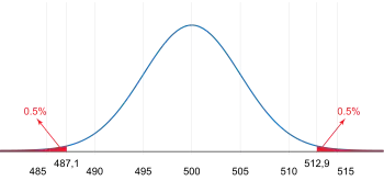 Logo, a probabilidade desejada é igual a área sob a curva normal padronizada entre e . Por meio da tabela padronizada normal, tem-se que a área entre e é igual a .[36]