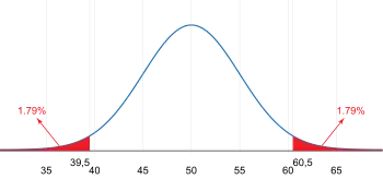 Portanto, sendo o número de caras esperado em 100 lançamentos e estabelecendo como hipóteses, onde é a hipótese nula representando uma moeda honesta e a hipótese alternativa representando uma moeda desonesta, temos que a probabilidade de se rejeitar a hipótese nula quando ela é verdadeira é a área total da curva normal menos a probabilidade do número de lançamentos estar entre 40 e 60. Isto é, . Logo, a probabilidade de se rejeitar a hipótese nula quando ela é verdadeira é . A partir da probabilidade de , define-se o nível de significância de .[37]