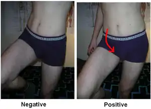 O sinal de Trendelenburg é dito positivo se, quando o quadril de um paciente que está de pé sustentado por somente uma perna, cai para o lado da perna levantada. A fraqueza é presente no lado da perna em contato com o chão.