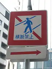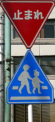 O sinal de parada japonesa é um triângulo vermelho, apontando para baixo com texto 止まれ (tomare?) que significa pare. Os sinais de proibição são redondos com fundos brancos, bordas vermelhas e pictogramas azuis. Já os sinais de instruções obrigatórias são redondos com fundos azuis e pictogramas brancos.[2]