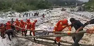Em Moxi, o pessoal da Brigada de Incêndio Florestal de Sujuão resgatou moradores presos dos escombros e transportou os feridos por um rio.[53] Pelo menos 50 pessoas feridas receberam tratamento por equipes médicas. O pessoal de emergência puxou mais de 30 pessoas presas sob os escombros. As equipes de resgate tiveram que cavar os destroços à mão, pois o equipamento de resgate não conseguia passar por passagens estreitas.[50]