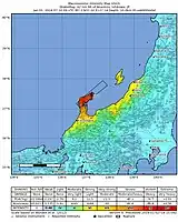 A Agência Meteorológica do Japão informou ter registado uma intensidade sísmica máxima de 7 (Shindo 7), o nível mais elevado na sua escala de intensidade sísmica,[19] a primeira vez que um terramoto dessa intensidade foi observado no país desde 2018.[20][21] A intensidade máxima foi reportada em Shika, província de Ishikawa. A intensidade 6+ foi registrada em Nanao, Wajima, Suzu e Anamizu. Intensidade 6– foi registrada em Nagaoka, na prefeitura de Niigata, e em Nakanoto e Noto em Ishikawa.[21] O terremoto também foi sentido por residentes em Tóquio e em toda a região de Kanto[8] e até a prefeitura de Aomori, no extremo norte de Honshu, até Kyushu, no sul do país.[20] Um pico de aceleração do solo de 2 826 galões foi observado em Shika, próximo ao registrado durante o terremoto de Tohoku em 2011, que mediu 2 934 galões.[22]