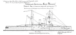 O Comitê Técnico Naval emitiu uma proposta em setembro de 1890 para um couraçado médio de 8,6 mil toneladas, cem metros de comprimento e armado com três canhões únicos de 305 milímetros em barbetas. Isto era uma tentativa de misturar o casco do couraçado de segunda linha Imperator Alexandr II com o armamento do Navarin em um orçamento apertado, comprometendo o projeto.[6] Nenhum almirante que avaliou a proposta ficou satisfeito e o comitê foi inundado com sugestões contraditórias.[7] As armas principais ficariam montadas em duas barbetas cobertas por cúpulas de 64 milímetros de espessura. O comitê inicialmente propôs como armamento secundário uma combinação do canhões russos Modelo 1877 de 152 milímetros e os britânicos Armstrong de 120 milímetros. Os almirantes Stepan Makarov e Vladimir Verkhovski aconselharam contra o uso de armas de diferentes tamanhos, pois isto causava problemas com controle de disparo, além de serem contra o uso do obsoleto canhão Modelo 1877. O comitê acabou fazendo o oposto, abandonando as armas Armstrong em favor do canhão russo, provavelmente por não querer usar uma arma estrangeira.[8] Um projeto revisado foi apresentado em março de 1891, com o deslocamento crescendo para nove mil toneladas e o armamento principal passando a ser de quatro canhões em barbetas duplas.[9]