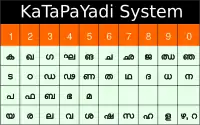 - Datas importantes foram lembradas convertendo-as usando o sistema Kaṭapayadi. Essas datas são geralmente representadas como o número de dias desde o início de Kali Yuga.[3] Às vezes é chamado de kalidina sankhya.