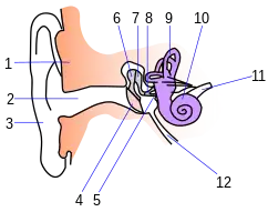 A orelha interna é composta pelo órgão vestibulococlear, responsável pela audição e pelo equilíbrio estático-dinâmico do corpo. A cóclea, principal responsável pela função auditiva,[1] é formada pelo labirinto ósseo, preenchido por um fluido chamado perilinfa (rico em sódio, Na+), e pelo labirinto membranoso, preenchido pela endolinfa (rico em potássio, K+). A diferença química entre esses dois líquidos é de extrema importância para a geração do impulso elétrico, o qual ocorre por meio da diferença de potencial entre estes íons. O labirinto ósseo é constituído por duas porções, a escala vestibular e a escala timpânica. Já o labirinto ósseo é constituído pela escala média, a qual possui a estrutura responsável pela transformação das ondas mecânicas em impulsos elétricos, o órgão de Corti.