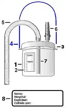 A Etiqueta de identificação (8) deverá ser preenchida e colada ao Frasco coletor (1) com as seguintes informações: