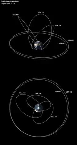 A configuração atual da "constelação" SDS-3, consistindo de três satélites em órbita Molniya e dois em órbita geoestacionária