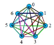 Para ilustrar este último exemplo, considera-se o grafo completo K7, formado pelo seguinte conjunto de vértices: V = {1, 2, 3, 4, 5, 6, 7}. Nesse grafo, considera-se o triângulo ligando os vértices 1, 2 e 4, conforme representado na figura 1. Se rotacionarmos esse triângulo para a direita, obtém-se o triângulo 2, 3 e 5, que não possui aresta em comum com o primeiro triângulo. Se este procedimento for repetido por mais cinco rotações, tem-se todas as triplas de S descritas como triângulos de K7.